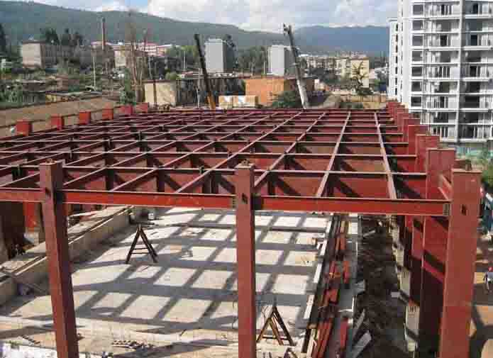 該工程鋼結構總量約600t,工程造價(jià)約500萬(wàn)元,主鋼柱截面為700×1300,重量約11t,主鋼梁截面為500×2000,跨度36m,重量約19t。八分公司在施工場(chǎng)地極其狹窄,基本無(wú)吊裝場(chǎng)地的情況下,經(jīng)過(guò)充分策劃和論證,將游泳池的底板作為拼裝、吊裝場(chǎng)地,把主鋼梁分三段制作在現場(chǎng)進(jìn)行拼裝,采用了180t汽車(chē)吊、兩臺50t汽車(chē)吊進(jìn)行吊裝。這種大型鋼結構在省內都極其罕見(jiàn),這次成功吊裝為八分公司鋼結構施工積累了寶貴經(jīng)驗。